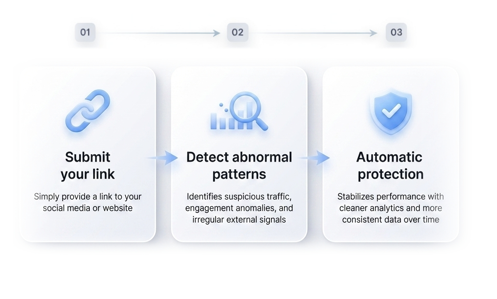 The system automatically detects abnormal traffic patterns, irregular external signals, and risk-related activity that can impact visibility, reach, engagement, and monetization.